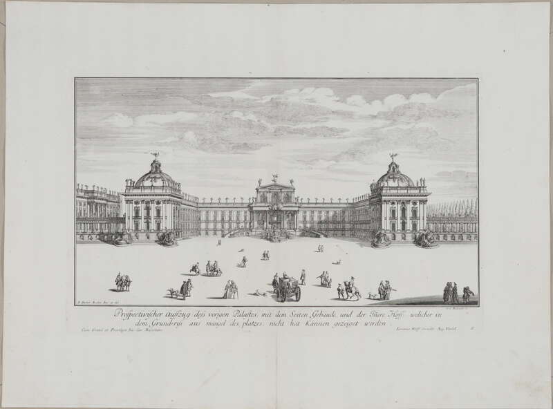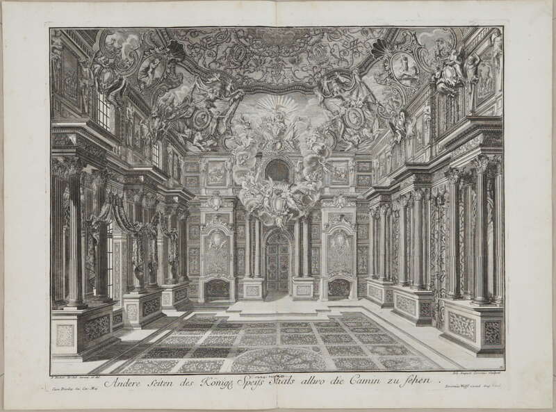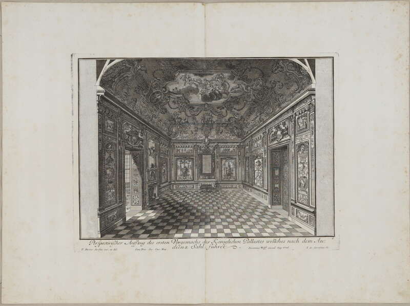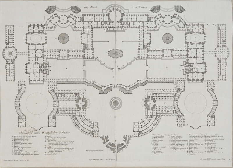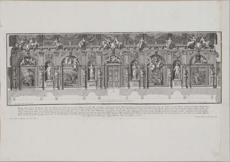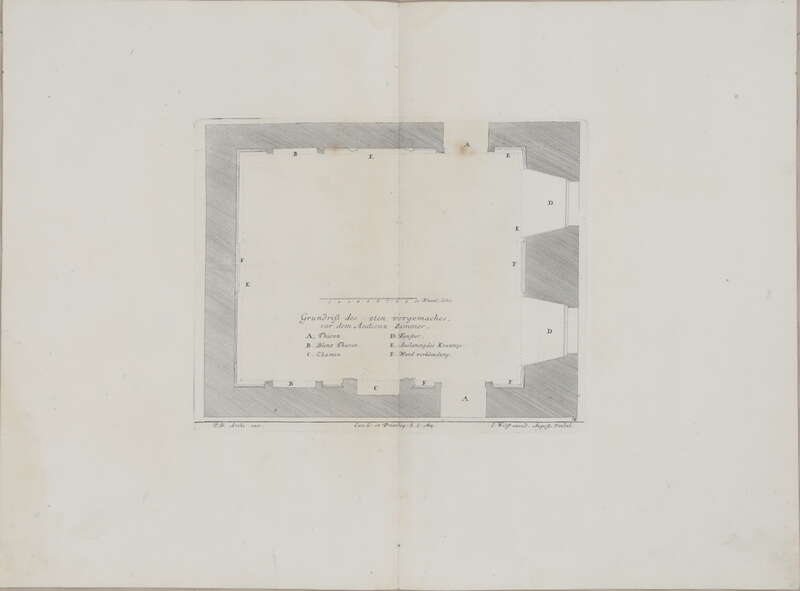 Fürstlicher Baumeister oder: ARCHITECTURA CIVILIS, Band I, Lange Seiten gegen die Fenster über der Gallerie, in welche man aus dem Cabinet mit Lit: K. bezeichnet, in den Grundriß des Haubt Geschoßes, nach dem Spazier Saal komen kan; ....